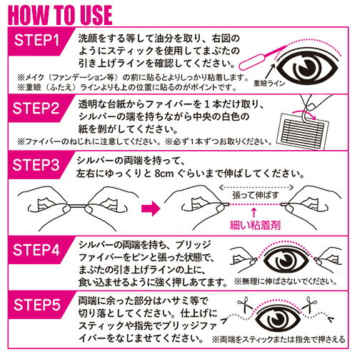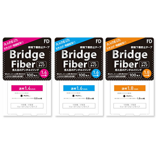 商品詳細 商品名 Bridge Fiber ブリッジソフトファイバー サイズ (幅×奥行×高さ)80×15×130mm 商品タイプ 透明:1.4mm、1.6mm、1.8mm 内容量 100本入/個 材質 紙、ポリエチレン、皮膚用アクリル粘着剤 商品説明 ● たるみが気になる大人まぶたを引き上げる ● やわらかく、スーッと軽く伸ばせるソフトタイプ ● しなやかで自然な使用感 ● 汗、皮脂、涙に強いウォータープルーフ 注意事項 ● 皮膚が荒れた場合はただちに使用を中止し、医師にご相談ください。